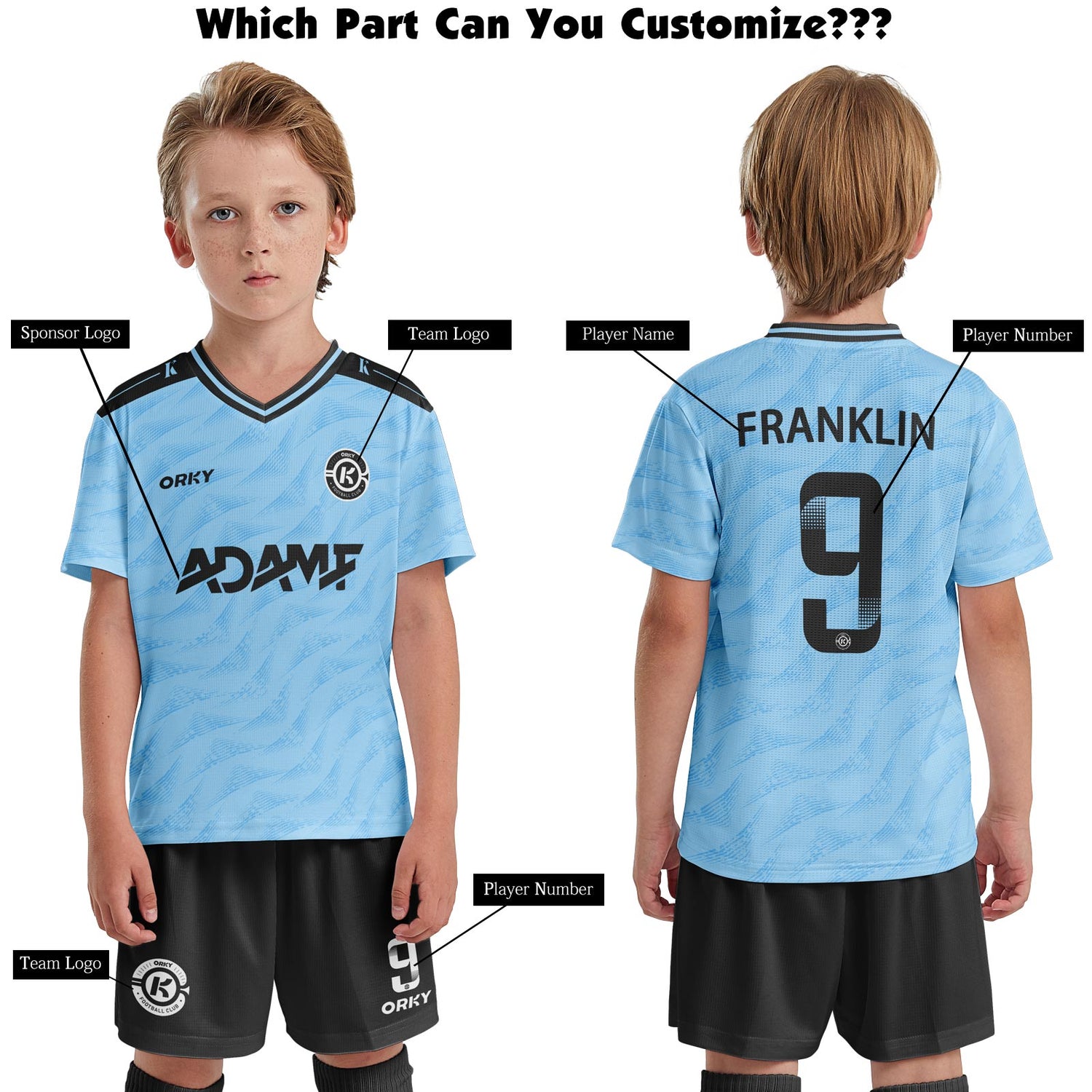 ORKY Youth Soccer Jersey with Short Customize Name Kids Blue Football Uniform